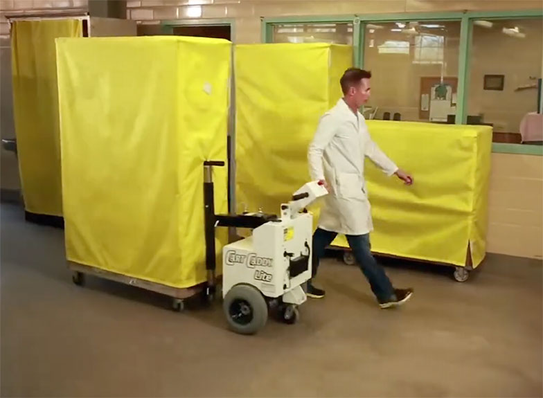 El CartCaddyLite elimina la carga física de empujar carros pesados como los de lavandería, suministros o mantenimiento, mejorando la seguridad, la productividad y las condiciones de trabajo en entornos hospitalarios.