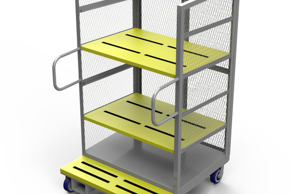 Construido en acero, enjaulado en tres lados para evitar que la mercancía se caiga. Superficie de seguridad antideslizante en los estantes plegables para contener una variedad de tamaños de productos y manijas en forma de D colocadas ergonómicamente. Peldaño de seguridad antideslizante al levantarlo.